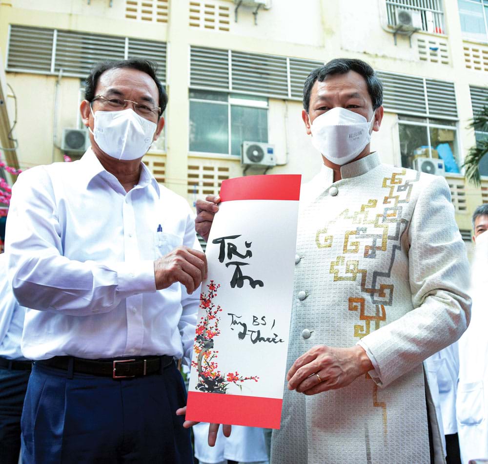 Ông Nguyễn Văn Nên (Ủy viên Bộ Chính trị, Bí thư Thành ủy TP.HCM) tặng chữ “Tri Ân” do ông viết cho PGS-TS-BSCK2. Nguyễn Tri Thức (Giám đốc Bệnh viện Chợ Rẫy) nhân dịp đến chúc Tết cán bộ, nhân viên Bệnh viện Chợ Rẫy ngày 26.1.2022. Ảnh: Duy Tính