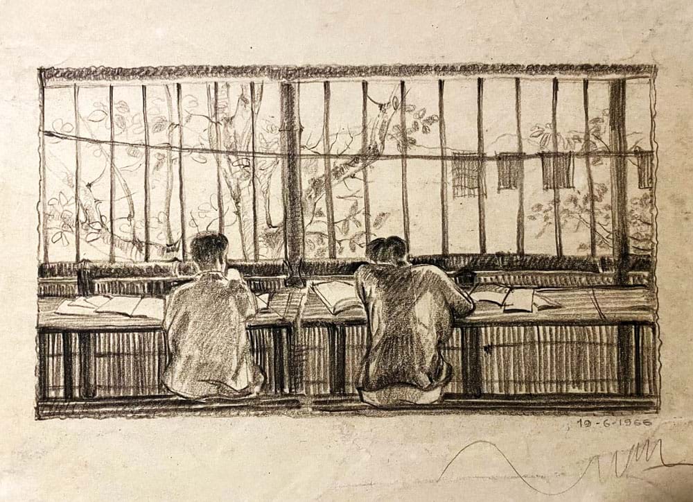 Ký họa bút chì hai bạn ngồi học bên cửa sổ lán ngủ tre nứa lá. Tranh: Trịnh Lữ
