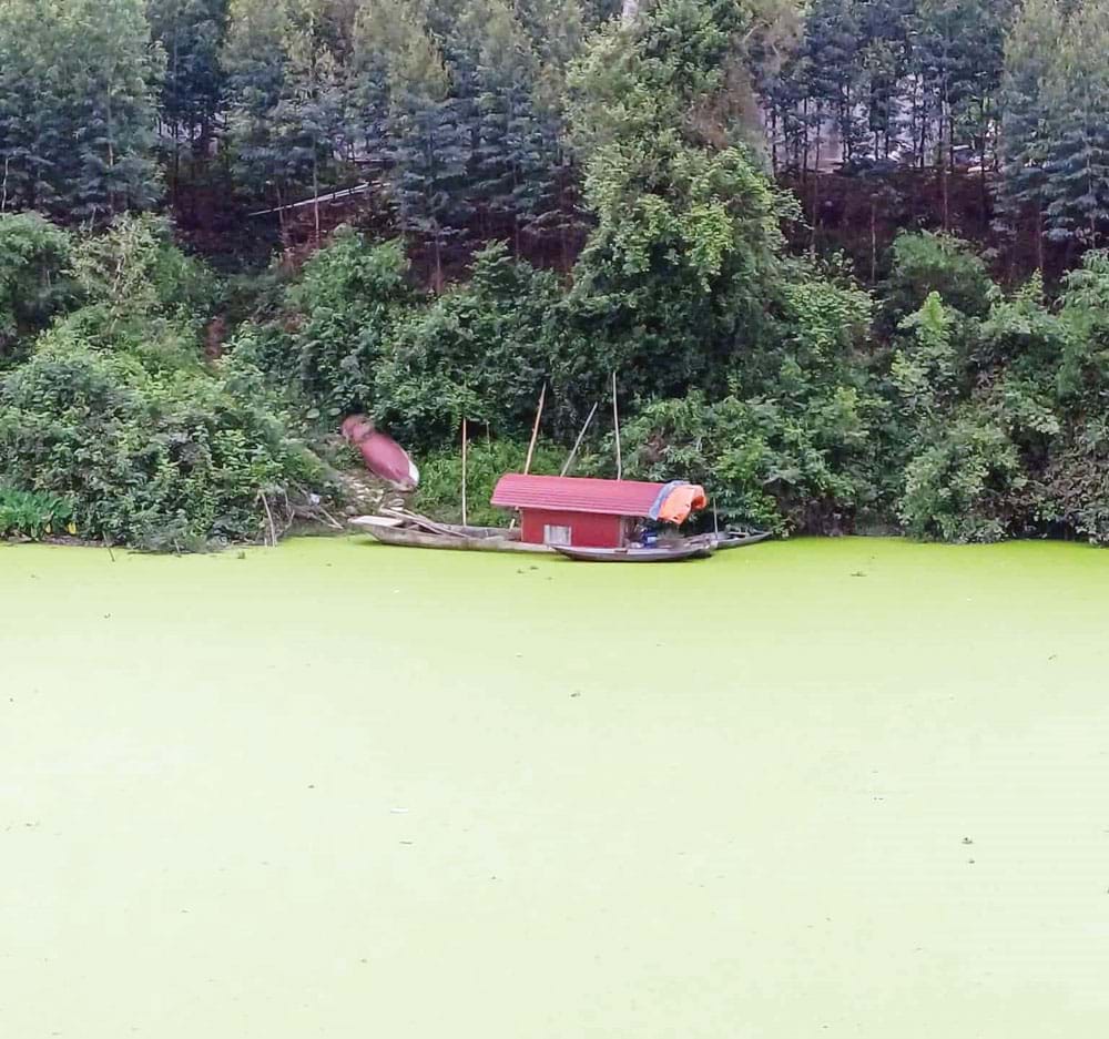 Khắp sông Thương phủ kín một loại bèo nhỏ màu xanh lục, năm 2023. Đấy là một sự dị thường. Ảnh: Nguyễn Quốc Vương