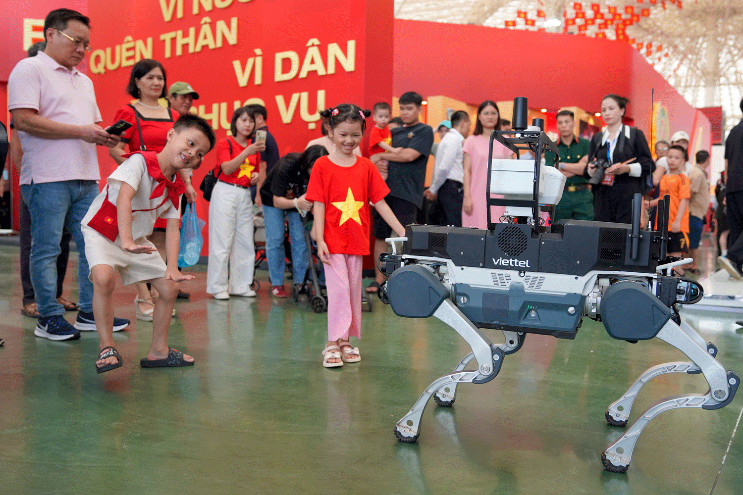 Trẻ em tương tác với robot tại triển lãm thành tựu Đất nước: “80 năm Hành trình Độc lập - Tự do - Hạnh phúc” (1945 - 2025). Ảnh: Nguyễn Đông
