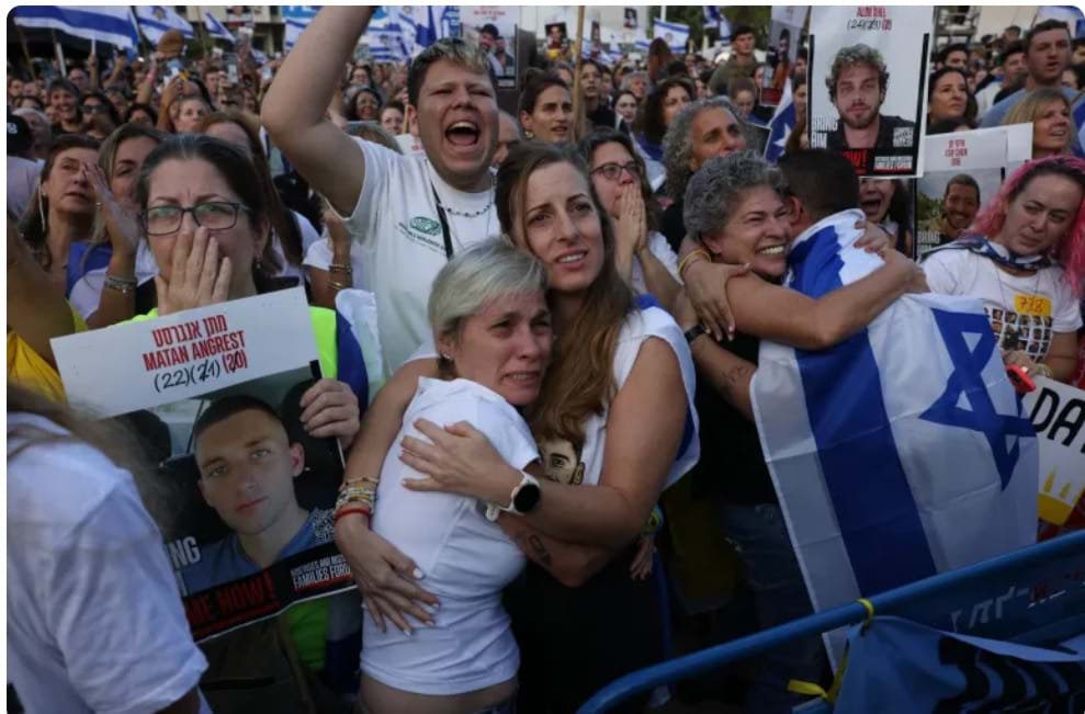 Gia đình và người thân chờ đợi tin tức của các con tin và thi thể người thân bị bắt giữ 738 ngày. Ảnh: AFP