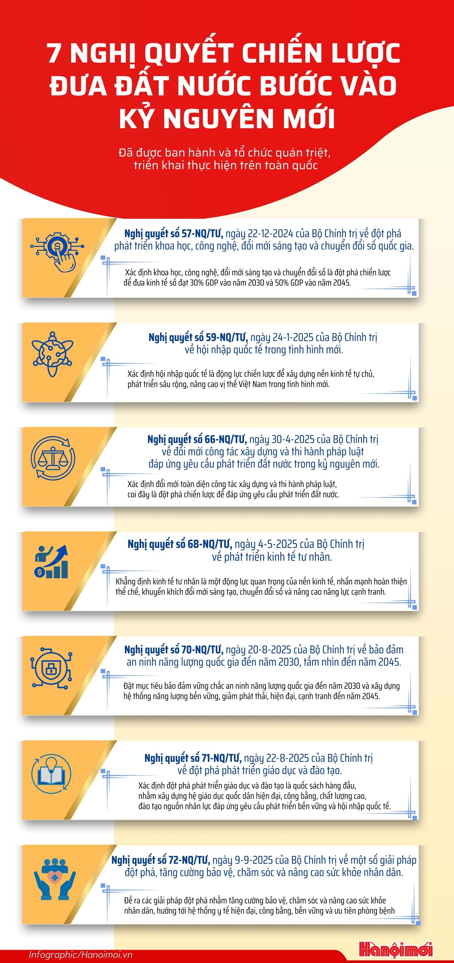 Cuối năm 2024 và trong năm 2025, Bộ Chính trị đã ban hành nhiều nghị quyết mang tính đột phá về đường lối, thể chế, chính sách, tạo nền tảng vững chắc để đất nước sẵn sàng bước vào kỷ nguyên mới: (1) Đột phá phát triển khoa học, công nghệ, đổi mới sáng tạo và chuyển đổi số quốc gia (số 57-NQ/TW ngày 22.12.2024); (2) Hội nhập quốc tế (số 59-NQ/TW ngày 24.1.2025); (3) Đổi mới công tác xây dựng và thi hành pháp luật đáp ứng yêu cầu phát triển đất nước trong kỷ nguyên mới (số 66-NQ/TW ngày 30.4.2025); (4) Phát triển kinh tế tư nhân (số 68-NQ/TW ngày 4.5.2025); (5) Bảo đảm an ninh năng lượng quốc gia đến năm 2030, tầm nhìn đến năm 2045 (số 70-NQ/TW ngày 20.8.2025); (6) Đột phá phát triển giáo dục và đào tạo (số 71-NQ/TW ngày 22.8.2025); (7) Một số giải pháp đột phá, tăng cường bảo vệ, chăm sóc và nâng cao sức khỏe Nhân dân (số 72-NQ/TW ngày 9.9.2025). Cùng với đó, chuẩn bị ban hành các nghị quyết về kinh tế nhà nước, kinh tế có vốn đầu tư nước ngoài và về văn hóa.