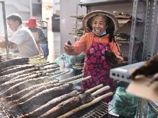 "Con đường cá lóc nướng" Tân Kỳ Tân Quý (quận Tân Phú, TP Hồ Chí Minh) tấp nập người mua, người bán cá lóc nướng trong ngày vía Thần Tài (mùng 10 tháng Giêng).