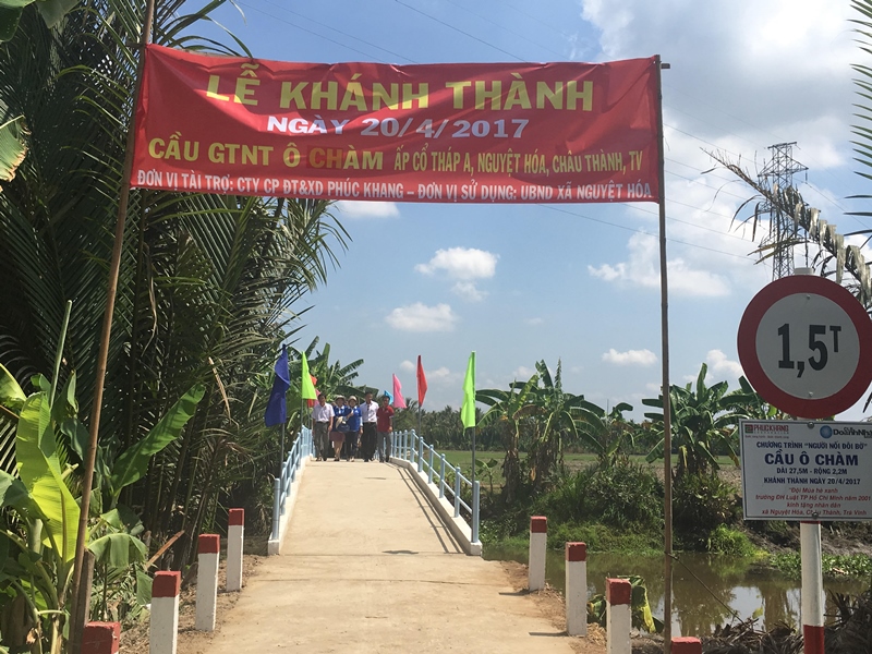 Ngày 20.4, Công ty CP Đầu tư & Xây dựng Phúc Khang đã phối hợp cùng CLB Doanh nhân Sài Gòn và lãnh đạo địa phương khánh thành cây cầu Ô Chàm ở ấp Cổ Tháp A, xã Nguyệt Hoá, huyện Châu Thành, tỉnh Trà Vinh.