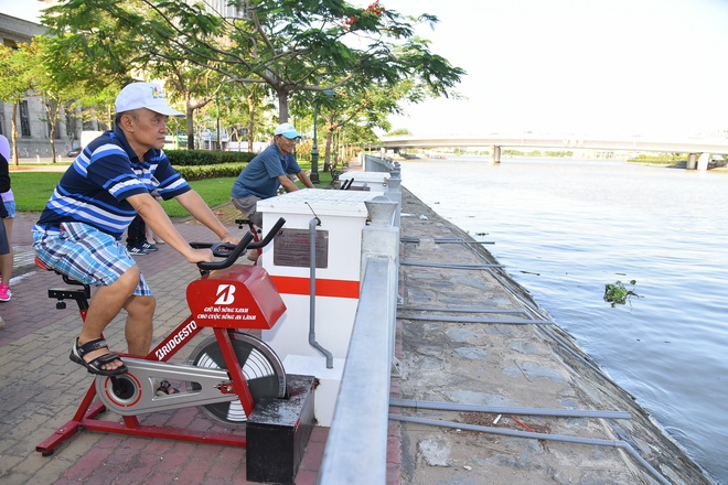 Sau 10 chiếc xe đạp lọc nước được lắp tại kênh Nhiêu Lộc, công ty Bridgestone vừa lắp thêm 4 chiếc xe đạp lọc nước tại khu vực Cầu Mống, đại lộ Võ Văn Kiệt, Q.1, TP.HCM.