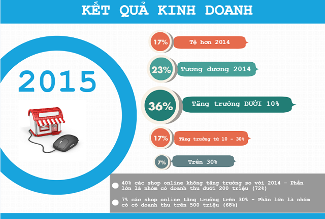 Khảo sát của công ty DKT từ 2.000 chủ cửa hàng kinh doanh trực tuyến (shop online) trong hơn 13.000 khách hàng của Bizweb, cho thấy việc kinh doanh của gần 40% chủ shop giẫm chân tại chỗ trong năm 2015.