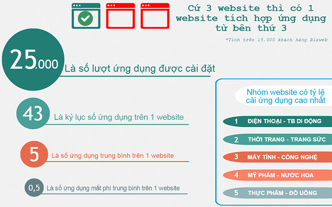 Dựa trên thói quen sử dụng website của 15.000 cửa hàng online tại Việt Nam, Bizweb đã nghiên cứu và đánh giá dữ liệu để dự báo hướng phát triển của website thương mại điện tử cũng như việc sử dụng website nền tảng mở để tích hợp các ứng dụng từ bên thứ 3. Theo đó khảo sát đưa ra nhận định, 2016 sẽ là năm khởi sắc của kho ứng dụng cho website.