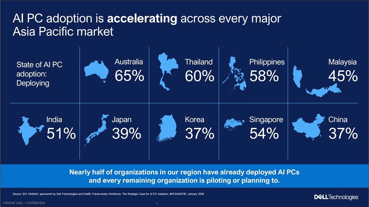 Tại Đông Nam Á, đà triển khai thậm chí còn nhanh hơn mức trung bình khu vực. Singapore, Malaysia, Thái Lan và Philippines đều ghi nhận tỷ lệ áp dụng AI PC từ 45% đến 60%. Lợi thế của khu vực này nằm ở khả năng tiếp nhận công nghệ mới linh hoạt, ít bị ràng buộc bởi hạ tầng cũ, cùng với các chính sách hỗ trợ tương đối thuận lợi.