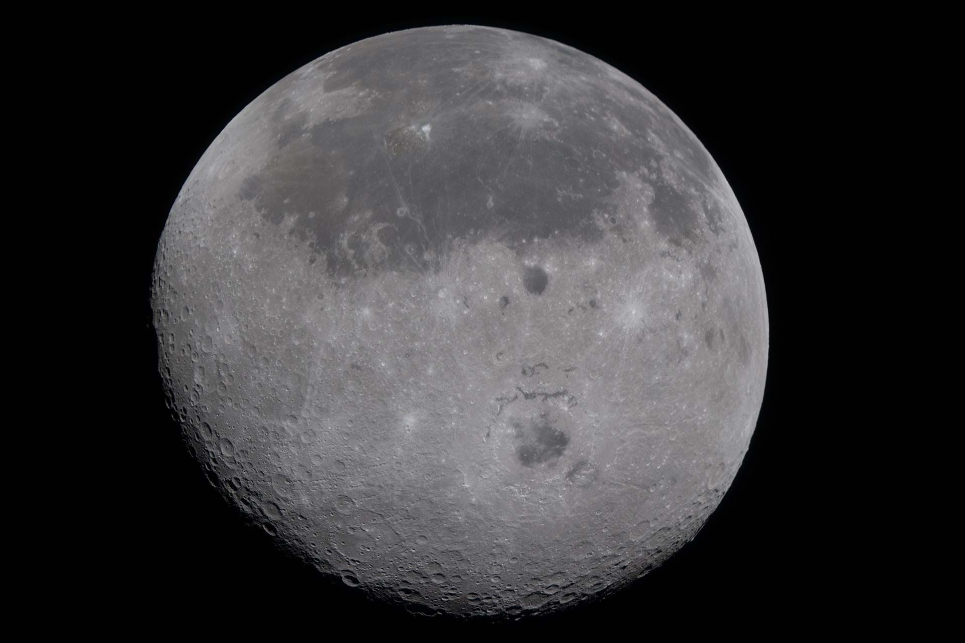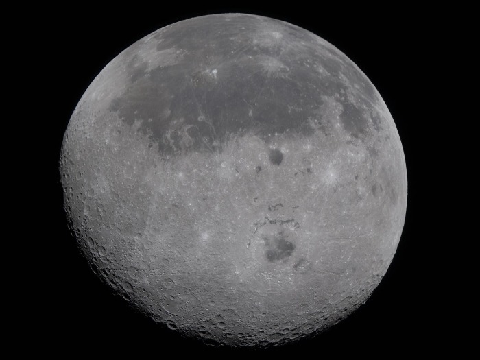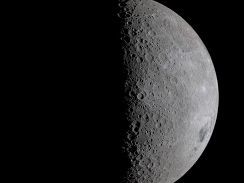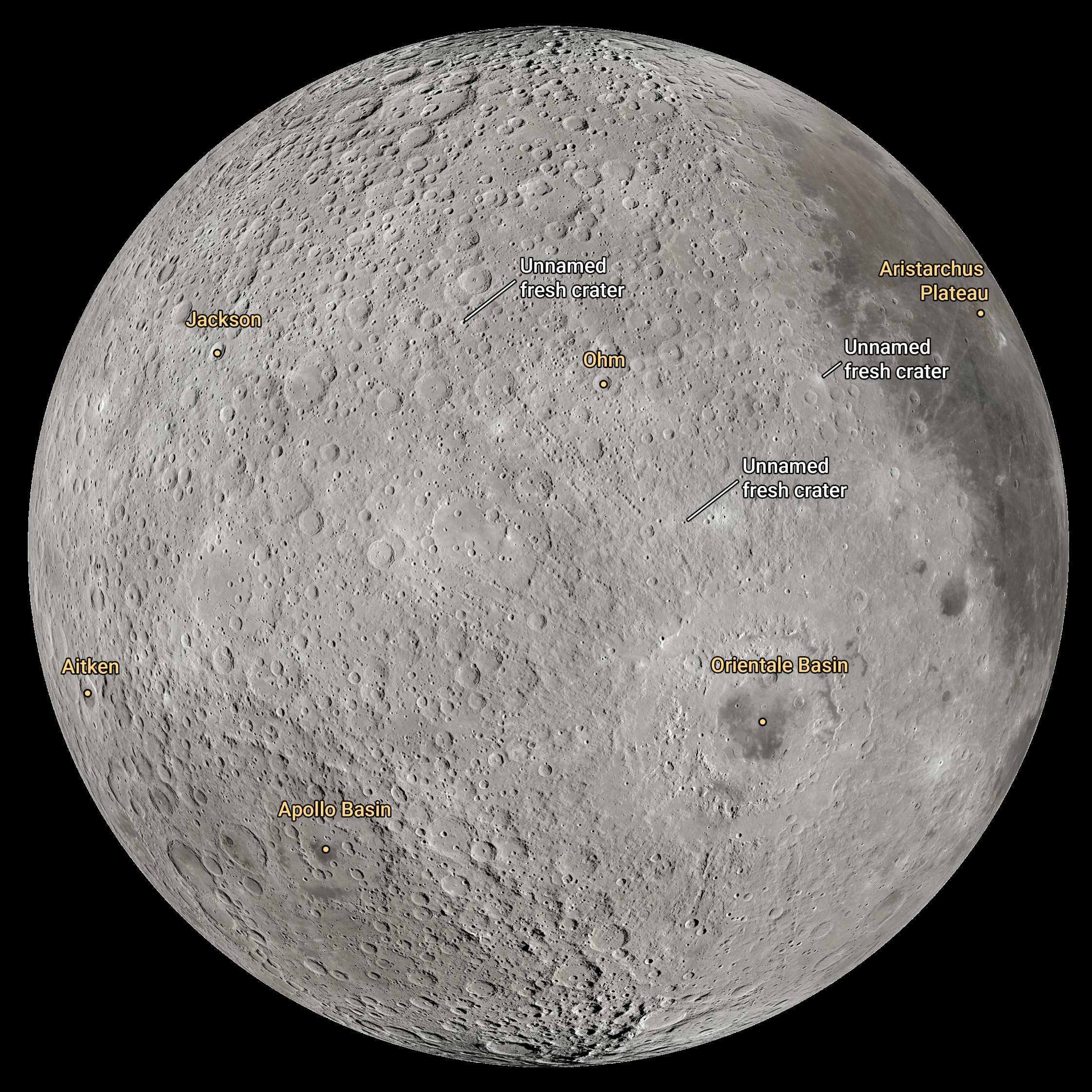 Đây là mặt gần của Mặt Trăng - bán cầu mà chúng ta nhìn thấy từ Trái Đất - có thể nhìn thấy ở nửa trên của đĩa Mặt Trăng, và các đốm đen. Đây là những dòng dung nham cổ đại từ thời kỳ đầu lịch sử của Mặt Trăng khi nó còn hoạt động núi lửa. Miệng núi lửa lớn xuất hiện bên dưới các dòng dung nham, tối ở trung tâm, là lưu vực Orientale, một miệng núi lửa rộng gần 600 dặm (khoảng 180 km) trải dài giữa mặt gần và mặt xa của Mặt Trăng và có thể nhìn thấy một phần từ Trái Đất ở rìa Mặt Trăng. Có thể nhìn thấy toàn bộ miệng núi lửa trong hình ảnh này. Mọi thứ bên dưới miệng núi lửa là mặt xa, bán cầu mà chúng ta không thể nhìn thấy từ Trái Đất vì Mặt Trăng quay quanh trục của nó với tốc độ tương đương với tốc độ quay quanh Trái Đất.