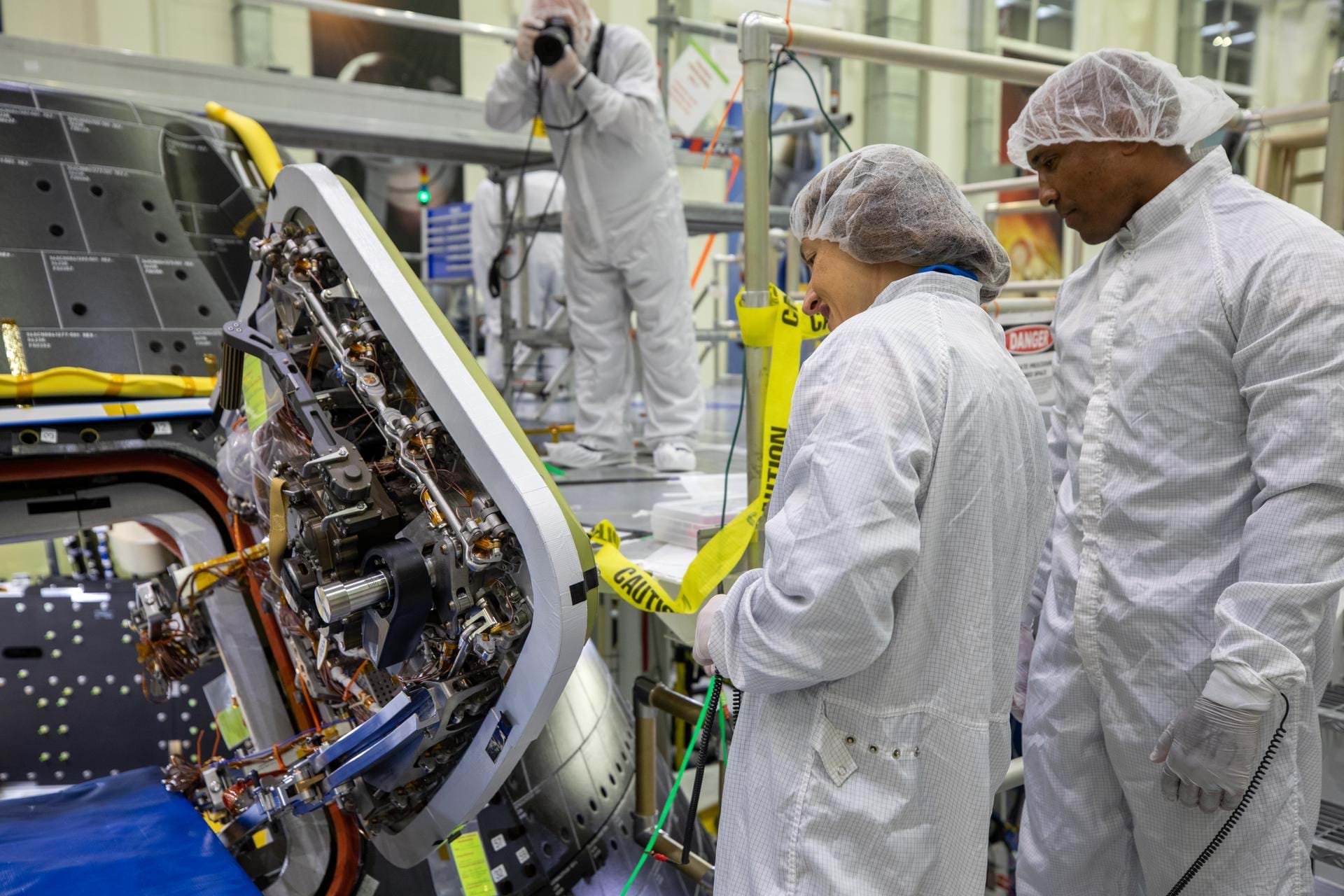 Từ trái sang phải, Christina Hammock Koch nữ phi hành gia đầu tiên bay vào không gian sâu, và phi công da màu Victor Glover đang kiểm tra khoang chứa phi hành đoàn Orion trong một lần chuẩn bị trước sứ mệnh, tại Tòa nhà Vận hành và Kiểm tra Neil A. Armstrong tại Trung tâm Vũ trụ Kennedy của NASA ở Florida.