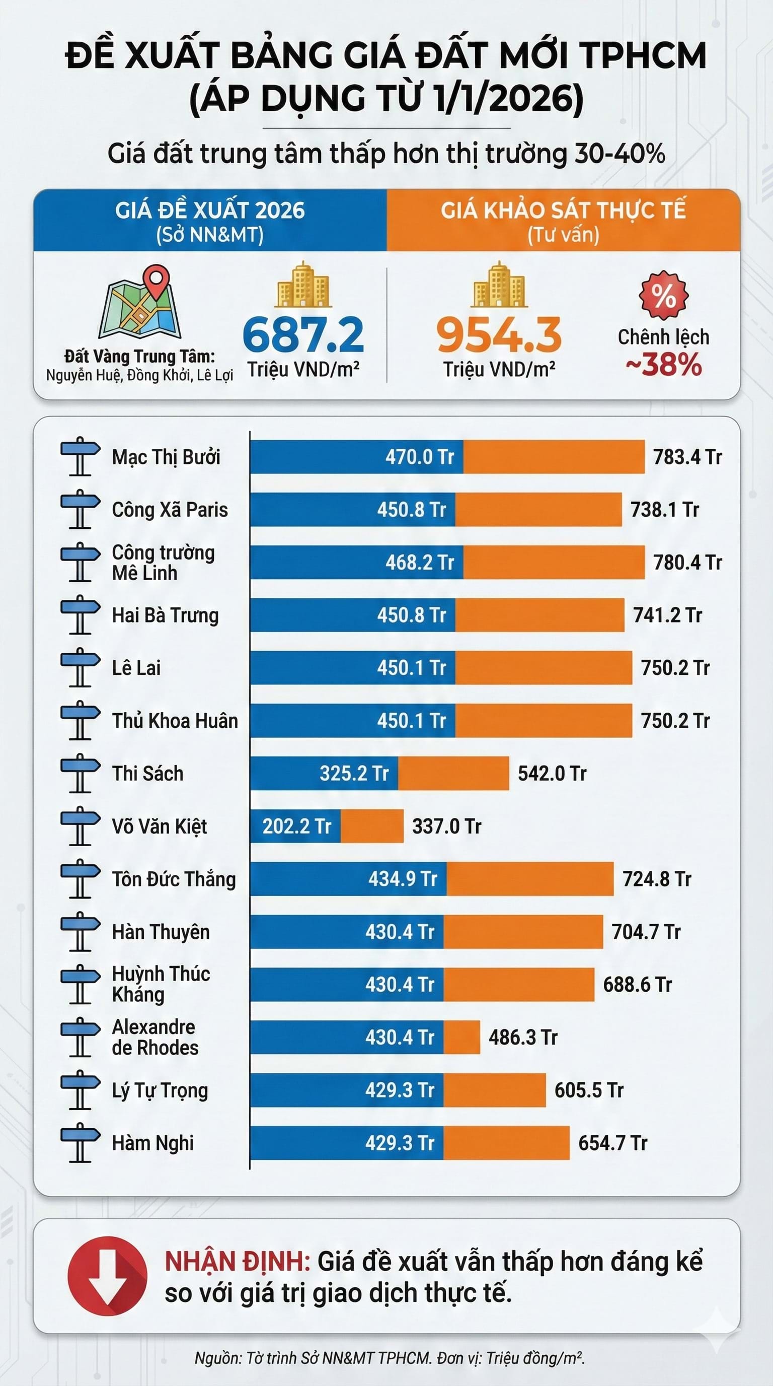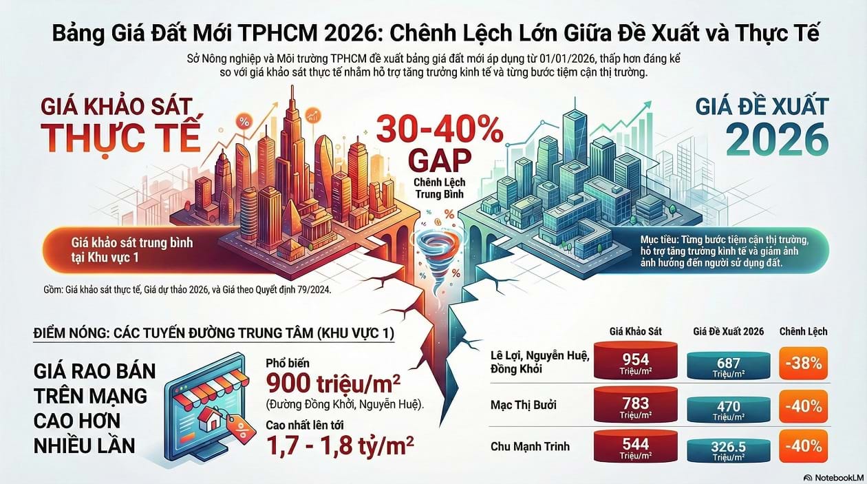 Ngay cả những tuyến có giá thấp nhất trong khu vực trung tâm, như đoạn Nguyễn Đình Chiểu (khu vực Hoàng Sa) hay tuyến đầu Võ Văn Kiệt, mức dự kiến áp dụng từ năm 2026 vẫn thấp hơn nhiều so với giá rao bán trên thị trường.