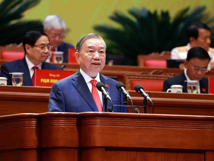 Tổng Bí thư Tô Lâm trình bày Báo cáo của Ban Chấp hành Trung ương Đảng khóa XIII về các văn kiện trình Đại hội XIV của Đảng. Ảnh: TTXVN
