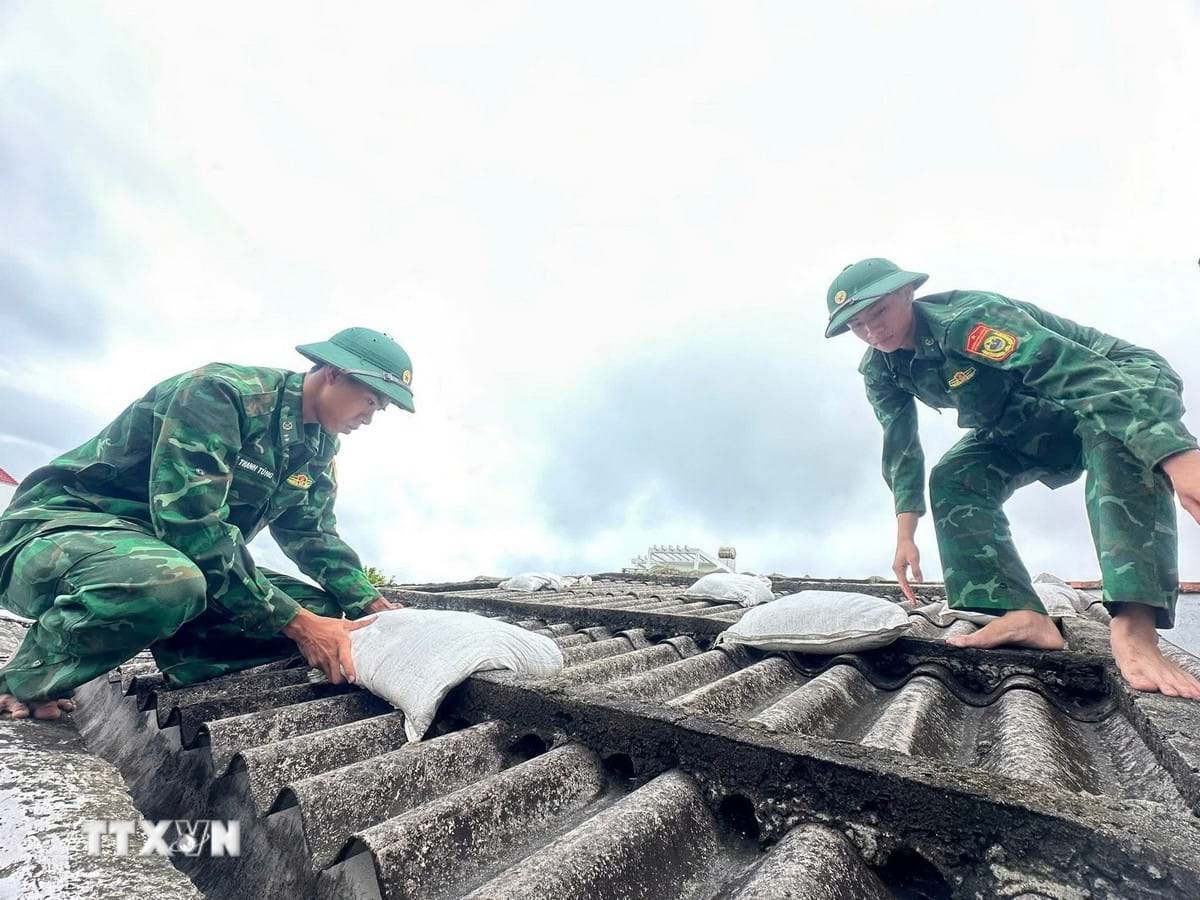 Các chiến sỹ giúp người dân đưa bao cát lên mái nhà để tránh tốc mái tôn khi gió bão. Ảnh: TTXVN