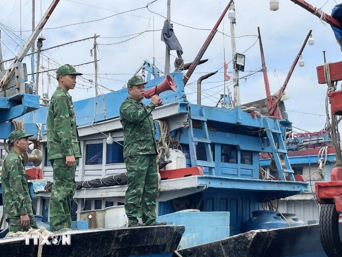 Bộ đội biên phòng dùng loa phóng thanh kêu gọi các tàu cá sắp xếp neo đậu an toàn tại cảng cá Sa Huỳnh. Ảnh: Phạm Cường/TTXVN