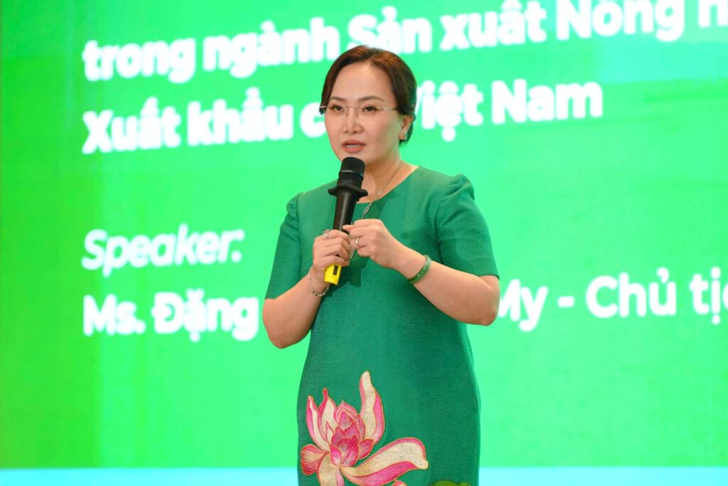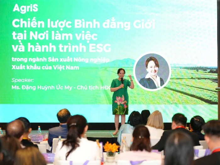 Bà Đặng Huỳnh Ức My, Chủ tịch Hội đồng Quản trị AgriS mang đến Diễn đàn một góc nhìn “phản biện” qua bài trình bày với chủ đề: “Chiến lược bình đẳng giới tại nơi làm việc và hành trình ESG trong ngành sản xuất nông nghiệp xuất khẩu của Việt Nam”. Ảnh: BSA Media