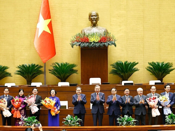 Tổng Bí thư Tô Lâm, Thủ tướng Phạm Minh Chính, Chủ tịch Quốc hội Trần Thanh Mẫn và các đồng chí lãnh đạo Đảng, Nhà nước tặng hoa chúc mừng các Phó Thủ tướng, Bộ trưởng và các Chủ nhiệm Ủy ban của Quốc hội. Ảnh: Doãn Tấn/TTXVN