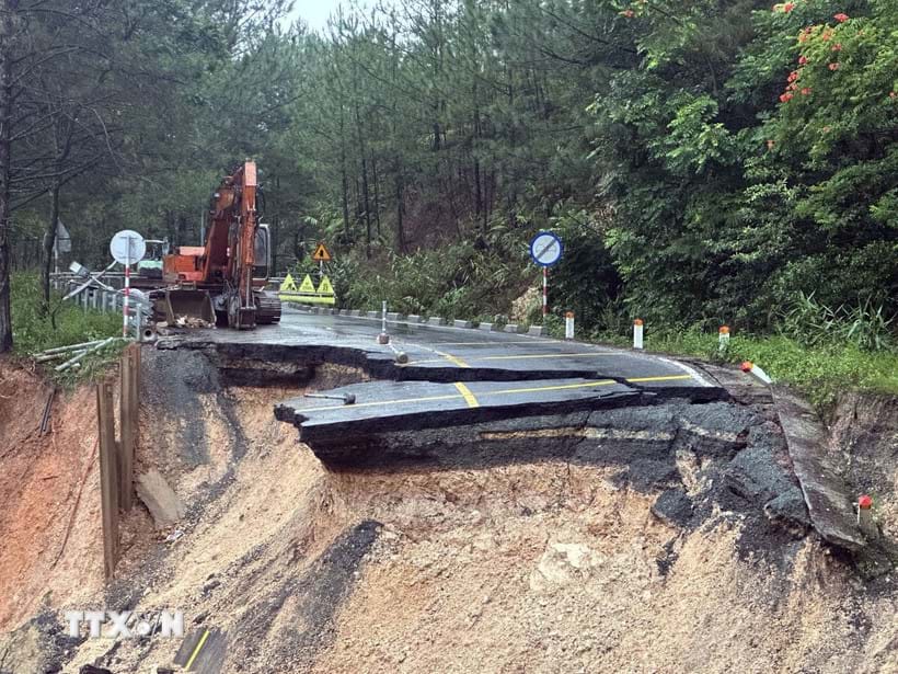 Toàn bộ tuyến đèo Mimosa bị tê liệt sau vụ sụt lún. Ảnh: Chu Quốc Hùng/TTXVN
