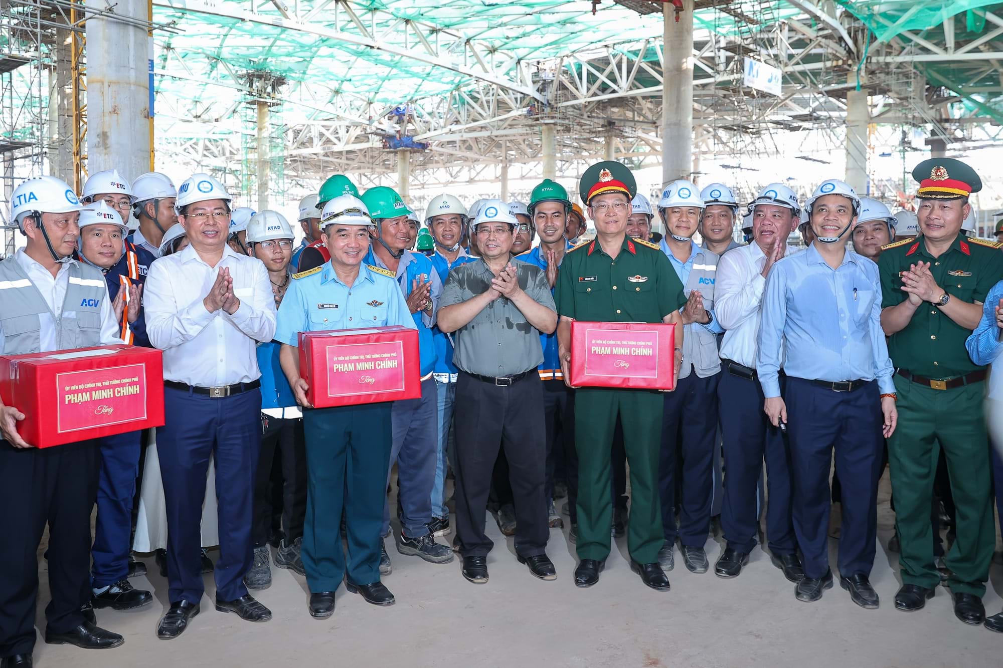Thủ tướng Phạm Minh Chính tặng quà, động viên cán bộ, công nhân, người lao động trên công trường thi công dự án Sân bay Long Thành, ngày 2.8.2025. Ảnh: VGP