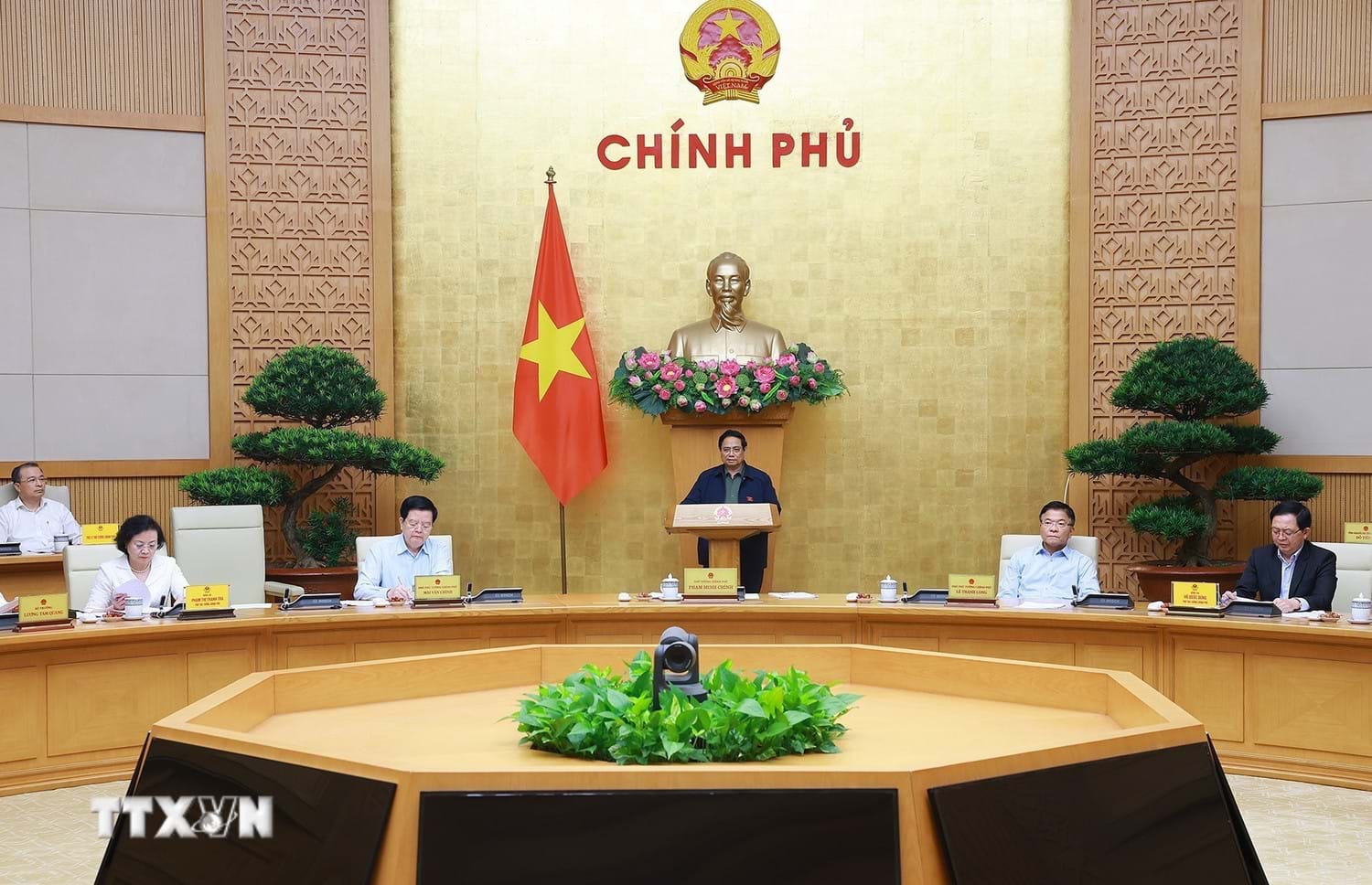 Thủ tướng Phạm Minh Chính chủ trì họp Chính phủ để đánh giá việc vận hành mô hình chính quyền địa phương 2 cấp. Ảnh: Dương Giang/TTXVN
