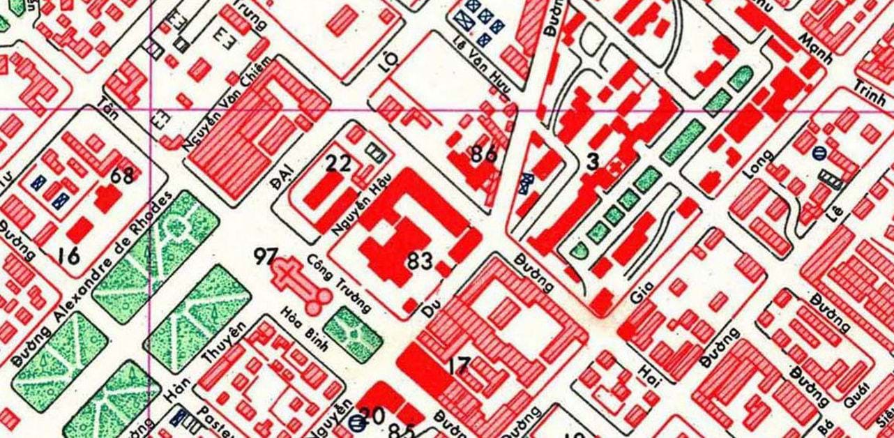 Bản đồ Sài Gòn năm 1968 ghi chú số 83 là Nha Tổng giám đốc Bưu điện gồm cả khối nhà giữa 4 con đường và khối nhà xây năm 1932. Ảnh tư liệu của Cù Mai Công