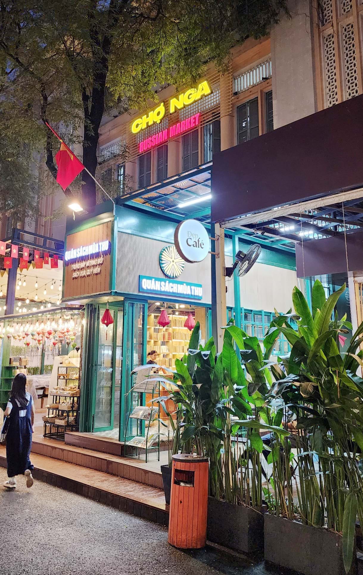 Sau phản ánh của báo chí, Viễn thông TP.HCM đã yêu cầu bên thuê mặt bằng tháo bảng hiệu Chợ Nga trên vách toà nhà liền kề Đường sách TP.HCM để “tránh gây hiểu nhầm”. Tuy nhiên nhiều chuyên gia di sản, văn hoá cho rằng cách xử lý này vẫn chưa đủ để bảo vệ không gian di sản và không gian văn hoá của khu vực thuộc vùng lõi di tích TP.HCM. Ảnh chụp vào tối 1.10.2025. Ảnh: Phúc Tiến