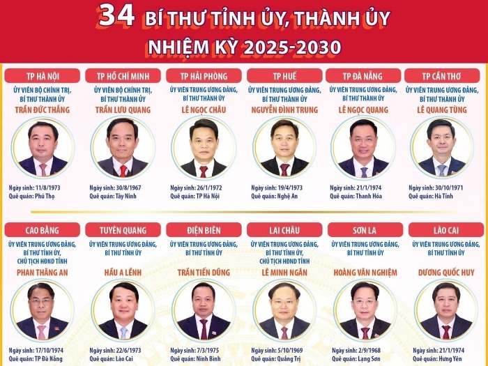 Infographic: 34 Bí thư Tỉnh ủy, Thành ủy nhiệm kỳ 2025-2030