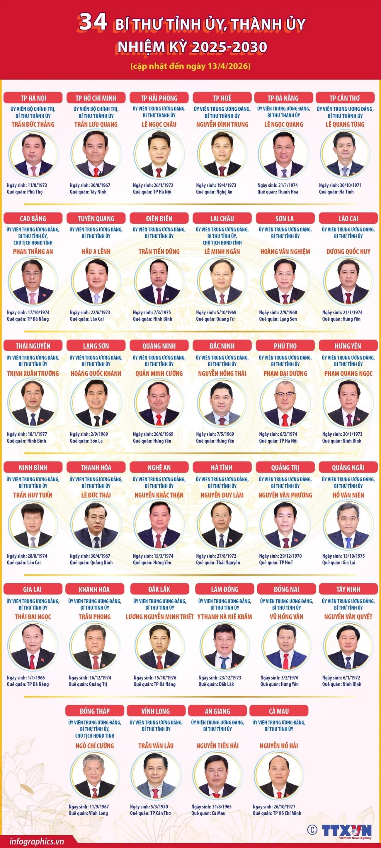 Trân trọng giới thiệu danh sách 34 Bí thư Tỉnh ủy, Thành ủy nhiệm kỳ 2025-2030 (cập nhật đến 13.4.2026).