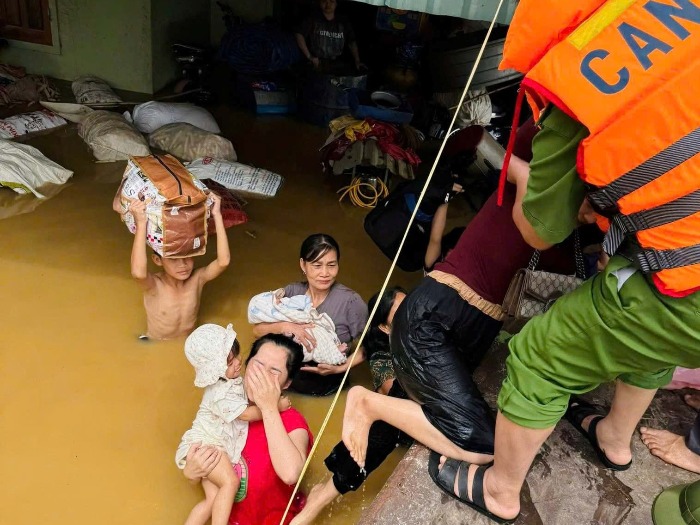 Lực lượng chức năng tiếp giải cứu người dân mắc kẹt trong những căn nhà bị ngập sâu ở xã Tân Kỳ, tỉnh Ngệ An. Ảnh: C.Tú/Báo Người Lao động