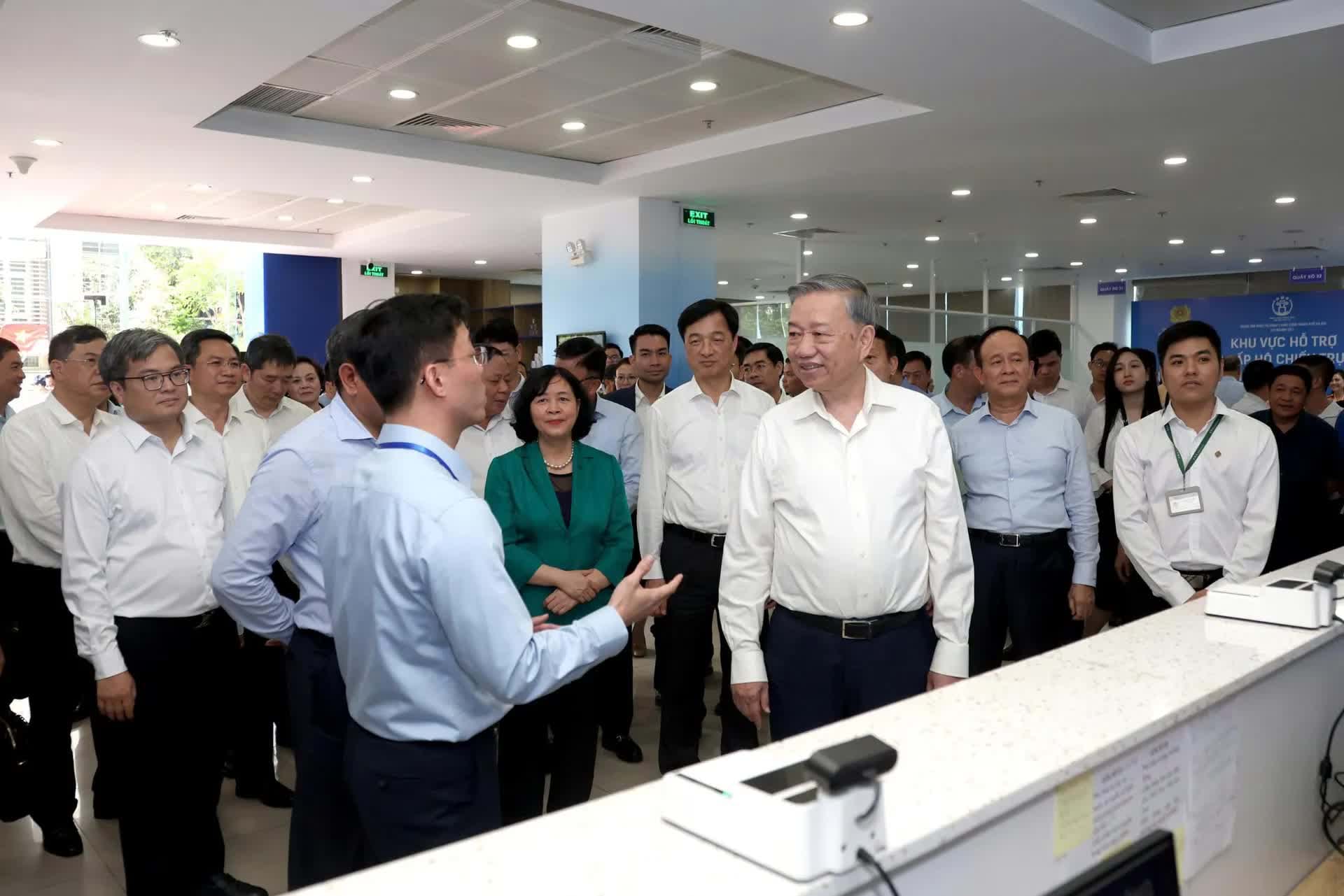 Tổng Bí thư Tô Lâm và các đồng chí lãnh đạo Đảng, Nhà nước, thành phố Hà Nội kiểm tra công tác vận hành mô hình chính quyền 2 cấp tại một số phường, xã của Thủ đô ngày 1.7.2025.