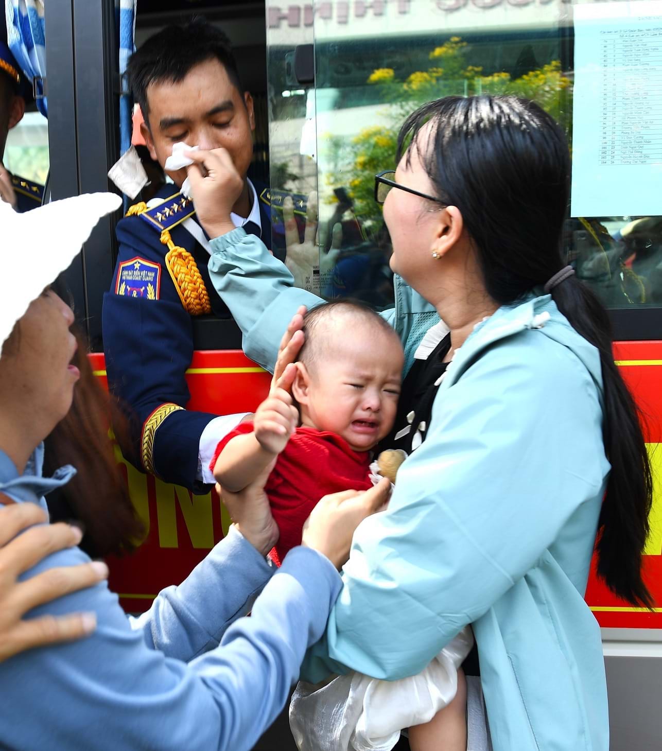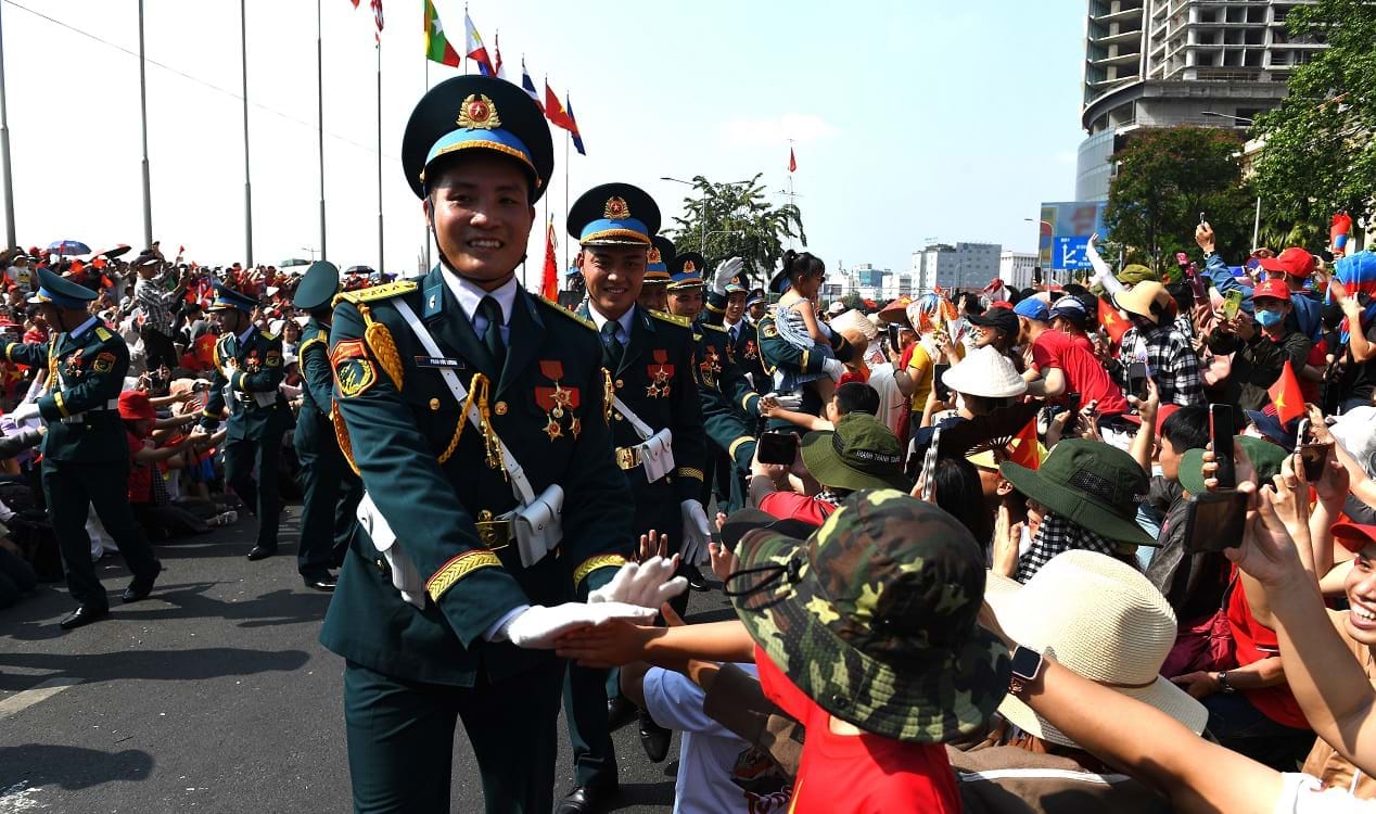 Những người lính vừa hoàn thành nhiệm vụ tại lễ diễu binh, diễu hành mừng 50 năm thống nhất đất nước rạng rỡ, hạnh phúc trong tình cảm ấm áp của người dân. Ảnh: Nguyễn Á