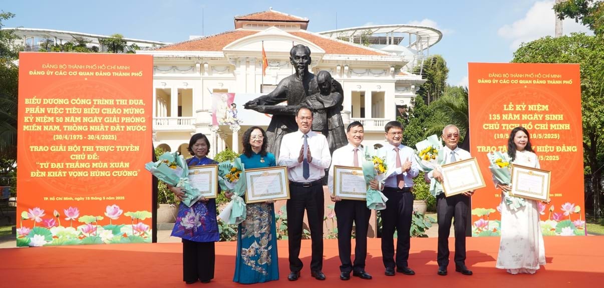 Lãnh đạo TP.HCM trao Huy hiệu Đảng cho các đảng viên. Ảnh: Báo Người Lao động