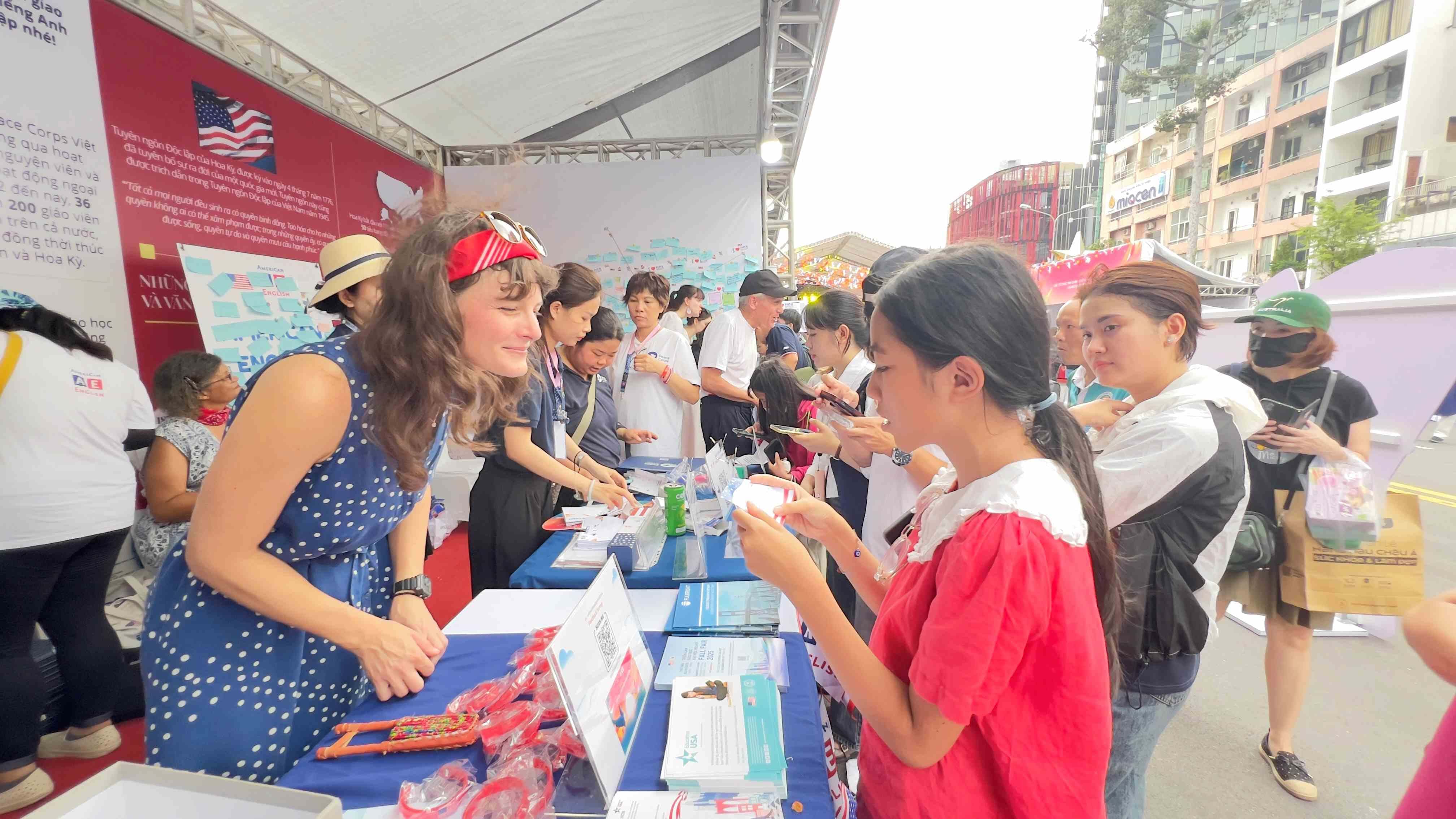 Các bạn trẻ tham gia trò chơi nhận quà tại gian hàng dạy tiếng Anh của nhóm Peace Corps trong khuôn khổ Ngày hội Giao lưu hữu nghị Hoa Kỳ - Việt Nam tại TP.HCM diễn ra dầu tháng 9.2025. Ảnh: Kim Dung