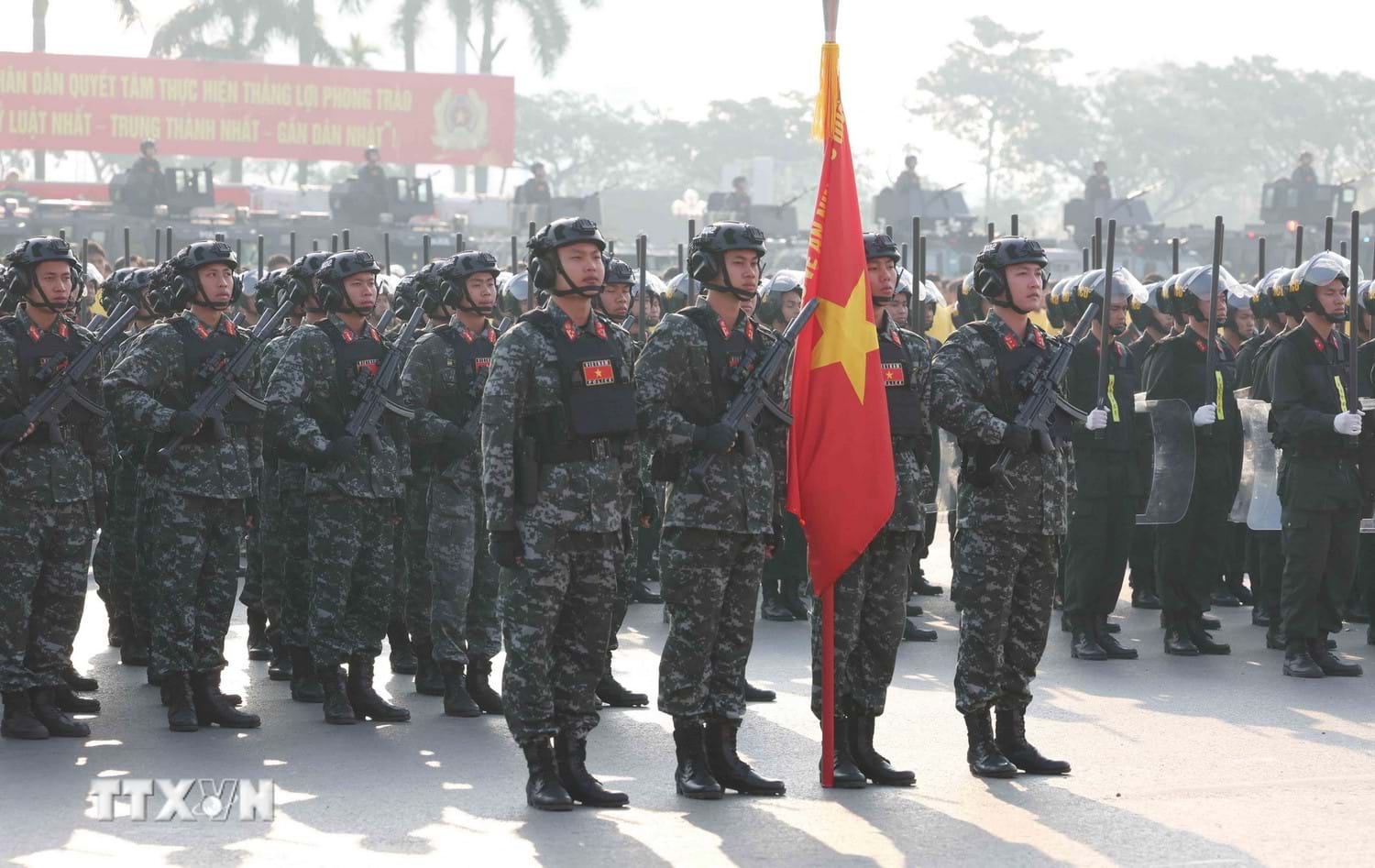 Các lực lượng tham gia Lễ xuất quân, diễn tập phương án bảo đảm an ninh, trật tự Đại hội đại biểu toàn quốc lần thứ XIV của Đảng. Ảnh: Phương Hoa/TTXVN