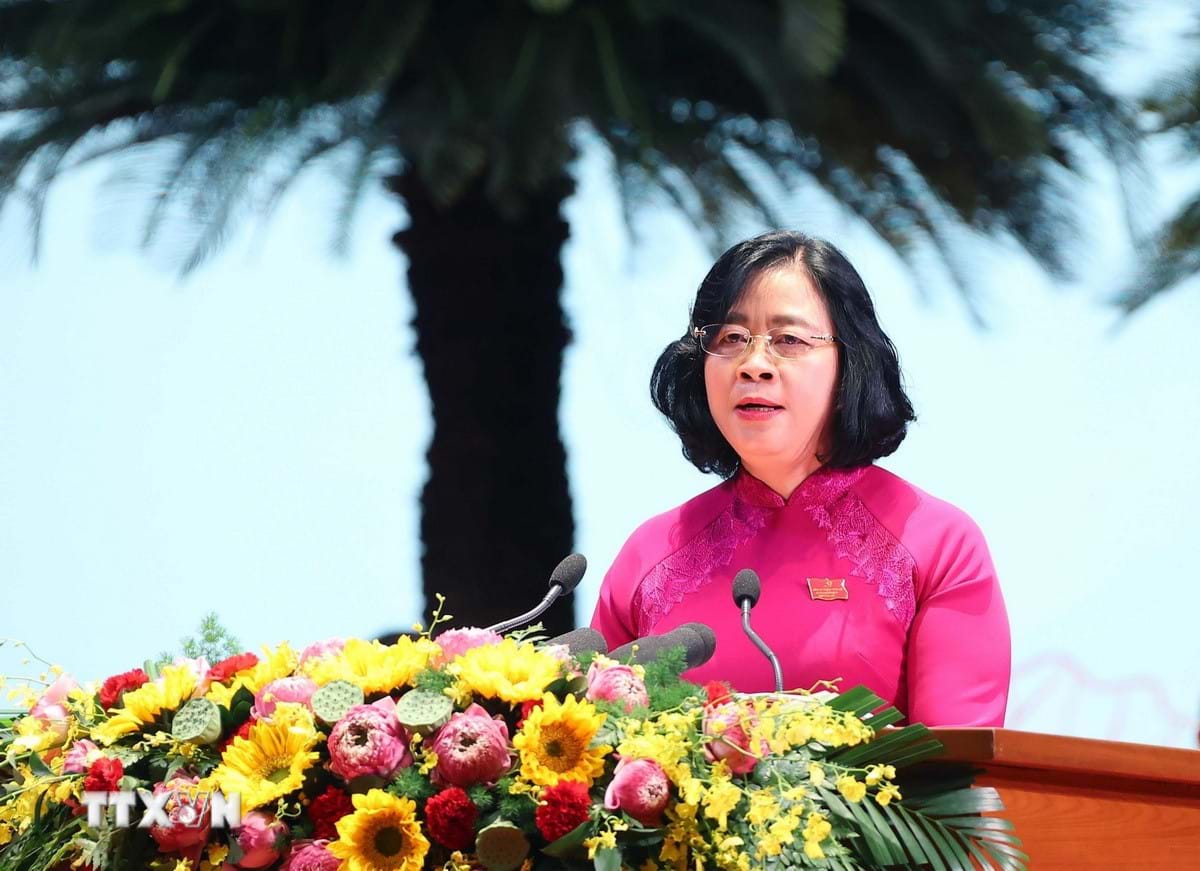Bà Bùi Thị Minh Hoài, Ủy viên Bộ Chính trị, Bí thư Thành ủy Hà Nội, đọc Diễn văn khai mạc Đại hội. Ảnh: Văn Điệp/TTXVN