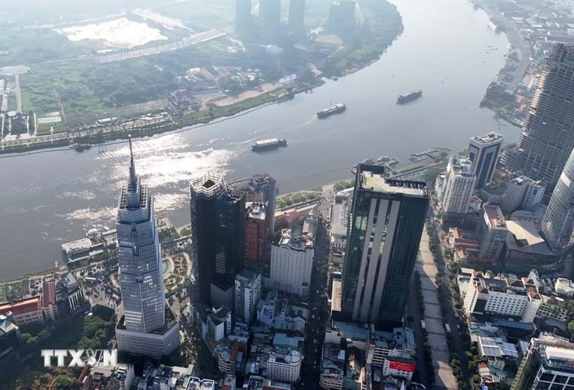 Các tòa nhà tài chính ở khu vực trung tâm Thành phố Hồ Chí Minh bên sông Sài Gòn, đối diện bán đảo Thủ Thiêm, phường An Khánh. Ảnh: Hồng Đạt/TTXVN