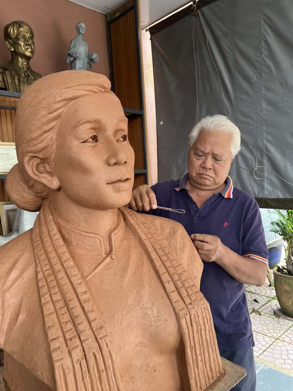 Điêu khắc gia Trần Thanh Phong và tác phẩm tượng bà Nguyễn Thị Bình.
