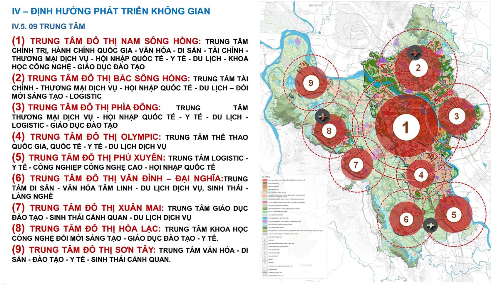 Cấu trúc đô thị đa cực được đề xuất trong quy hoạch thể hiện rõ tư duy đó. Đô thị trung tâm tiếp tục giữ vai trò hạt nhân về hành chính, chính trị và văn hóa, được kết nối với các đô thị vệ tinh như Hòa Lạc, Sơn Tây, Xuân Mai, Phú Xuyên, Sóc Sơn thông qua hệ thống giao thông lớn. Mỗi đô thị vệ tinh được định hướng đảm nhận một chức năng riêng như công nghệ cao, công nghiệp, dịch vụ, giáo dục, thể thao hay logistics.