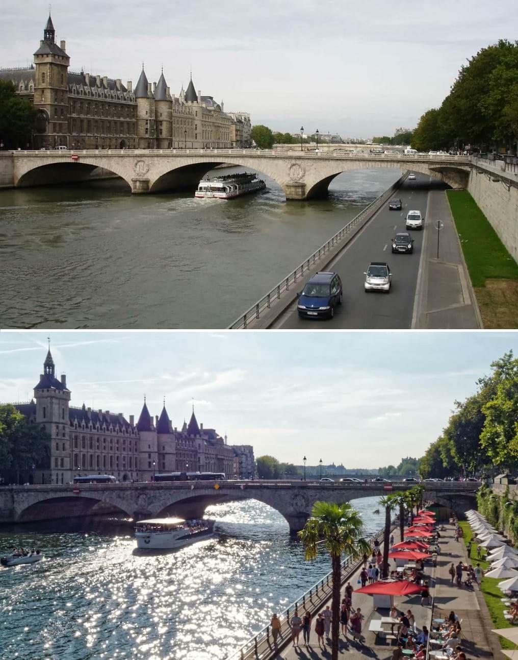 Bờ sông Seine trước và sau khi đóng cửa các tuyến đường ô tô ven sông, đặc biệt là đoạn bờ phải, để hình thành Parc Rives-de-Seine – một không gian đi bộ, xe đạp và sinh hoạt cộng đồng liên tục kết nối con người và mặt nước. Ảnh: TL