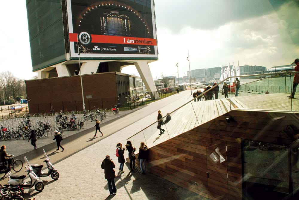 Bảo tàng phim EYE cạnh tòa tháp Overhoeks tiếp cận từ tuyến phà công cộng tại trung tâm Amsterdam.
