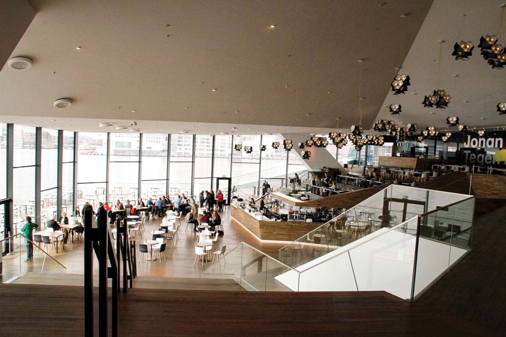 Thiết kế nội thất liên kết không gian nhà hàngdẫn đến khu trưng bày, triển lãm với không gian phía ngoài sát bờ sông nhờ tường kính trong suốt.