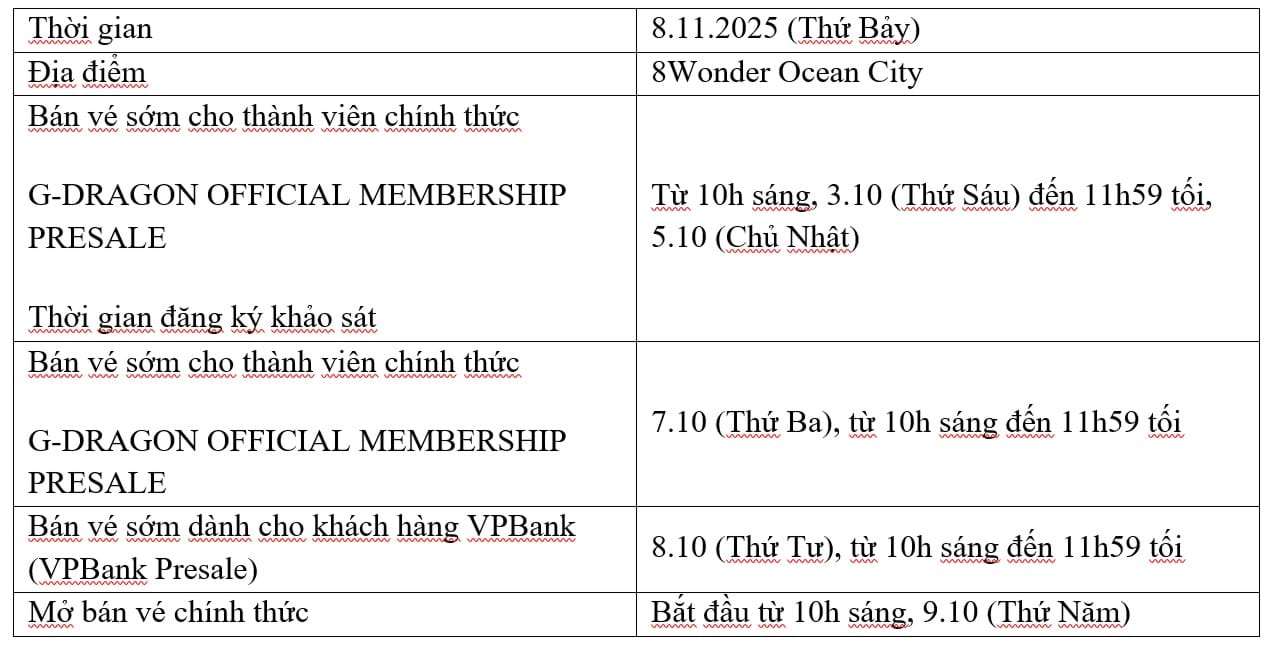 Theo đó, đợt bán vé sớm dành cho thành viên chính thức G-DRAGON OFFICIAL MEMBERSHIP Presale sẽ diễn ra từ 10h sáng đến 11h59 tối (giờ địa phương) ngày 7.10 (Thứ Ba).