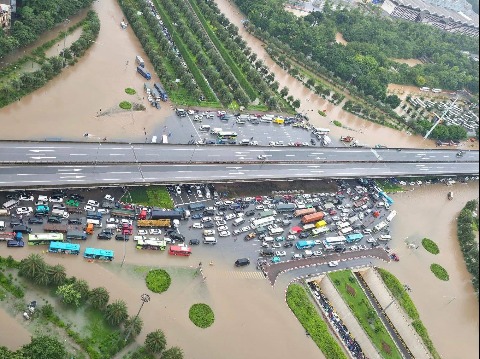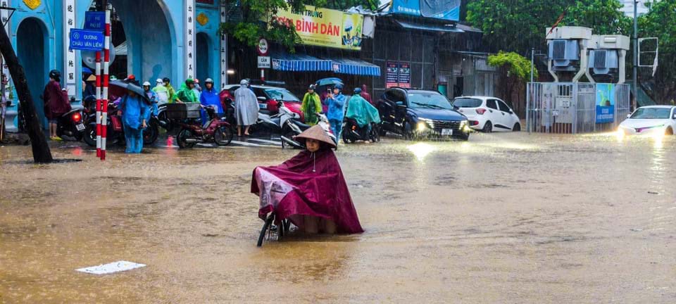 Nhiều tuyến đường phố của Hà Nội vẫn còn bị ngập sâu trong sáng 8.10. Ảnh: Vietnam+