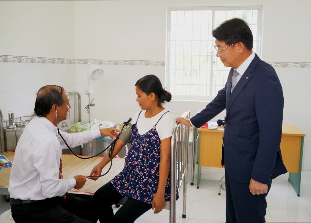 Ông Back Jong Kook, Chủ tịch HĐTV kiêm Tổng giám đốc Hanwha Life Việt Nam thăm hỏi người dân Trà Vinh trong ngày khánh thành Trung tâm Y tế Phường 9, thành phố Trà Vinh.