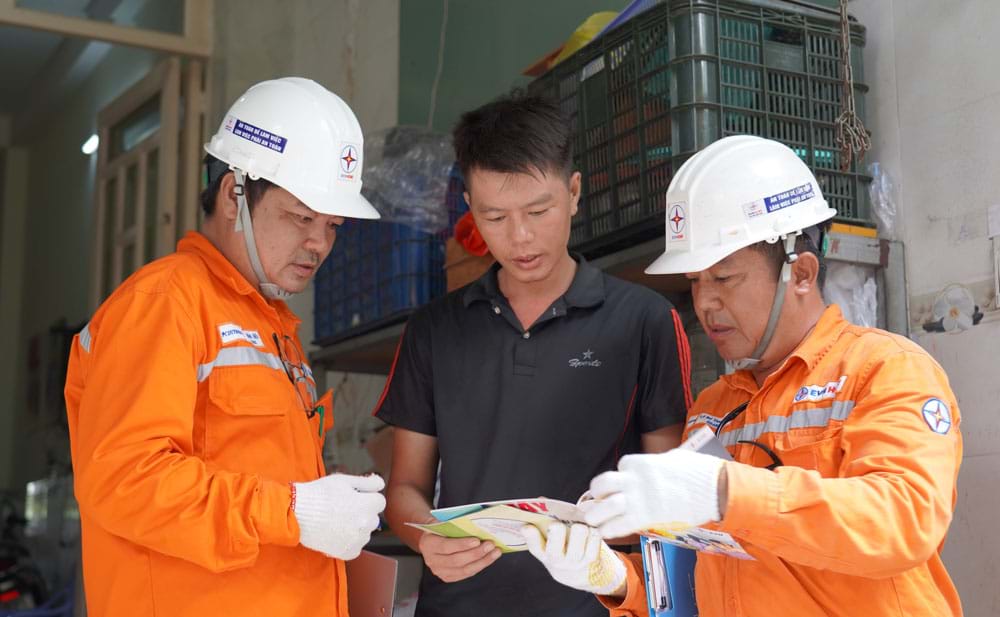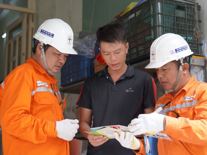 Nhân viên điện lực hướng dẫn người dân áp dụng các biện pháp tiết kiệm, hiệu quả để hạn chế chi phí tiền điện tăng cao mùa nắng nóng. Ảnh: CTV