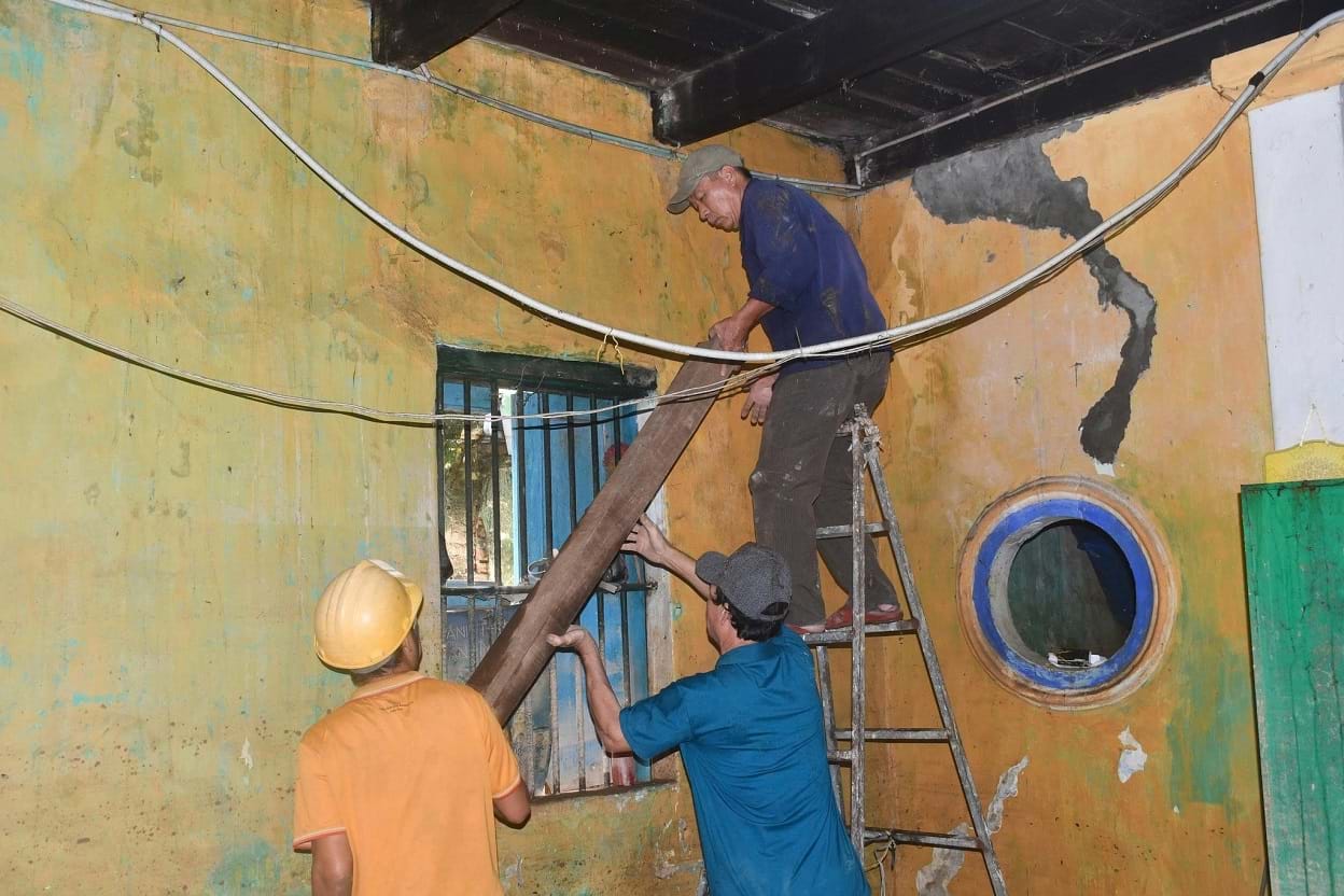 Hỗ trợ chống đỡ tại một di tích nhà cổ trước bão lũ.