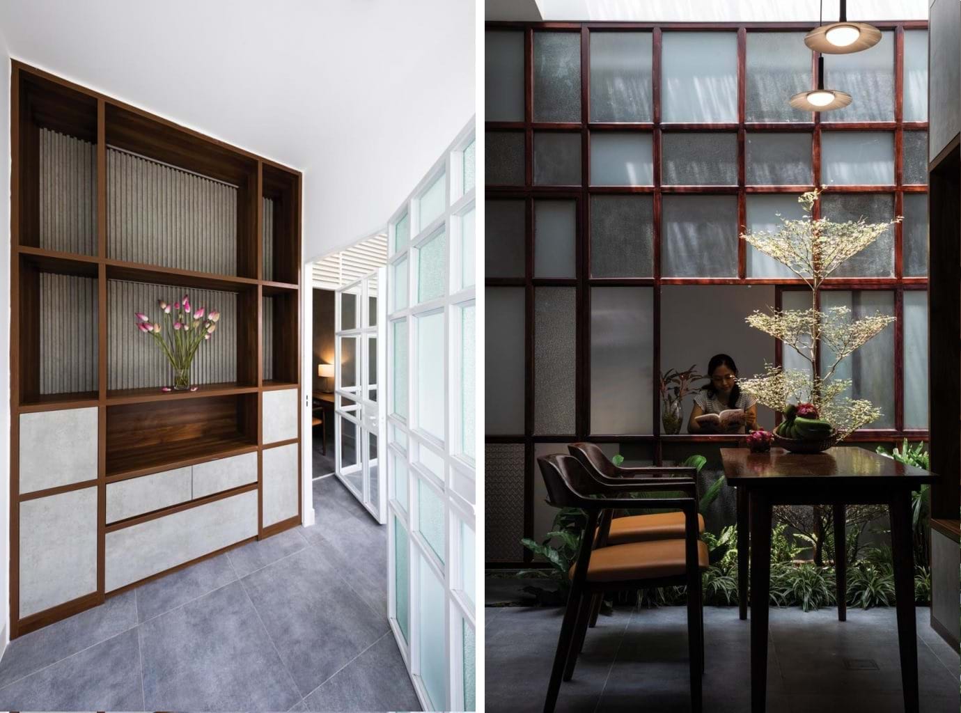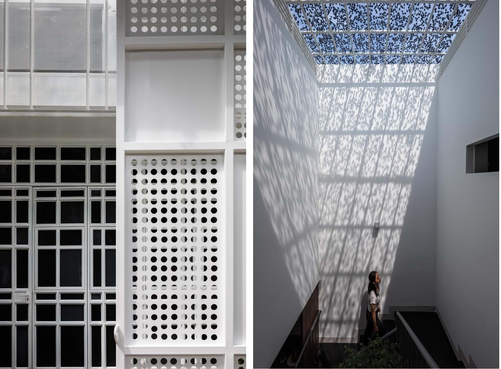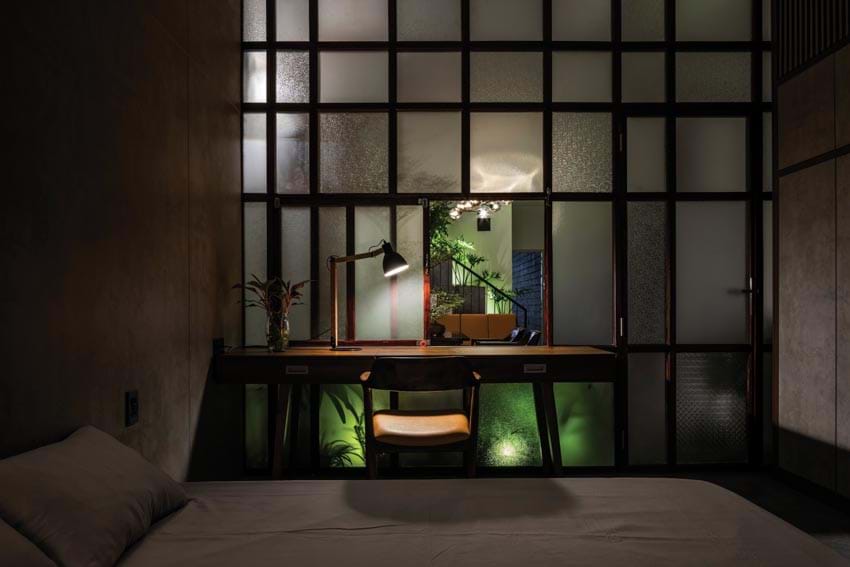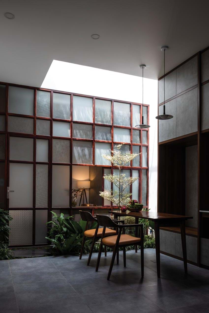 Cụ thể, kính solar được sử dụng vừa có tác dụng giảm 40-45% lượng nhiệt cho khu vực giếng trời đồng thời điều tiết ánh sáng, tạo bóng râm bằng giải pháp rải đá mi phía trên kính. Nhờ vậy không gian nội thất luôn ngập tràn ánh sáng tự nhiên nhưng không gây nóng bức. Hơn nữa, bóng đổ xuyên qua bề mặt có lớp đá tạo hiệu ứng tương tự hoa nắng xuyên qua tán cây, cho một cảm giác rất dễ chịu.