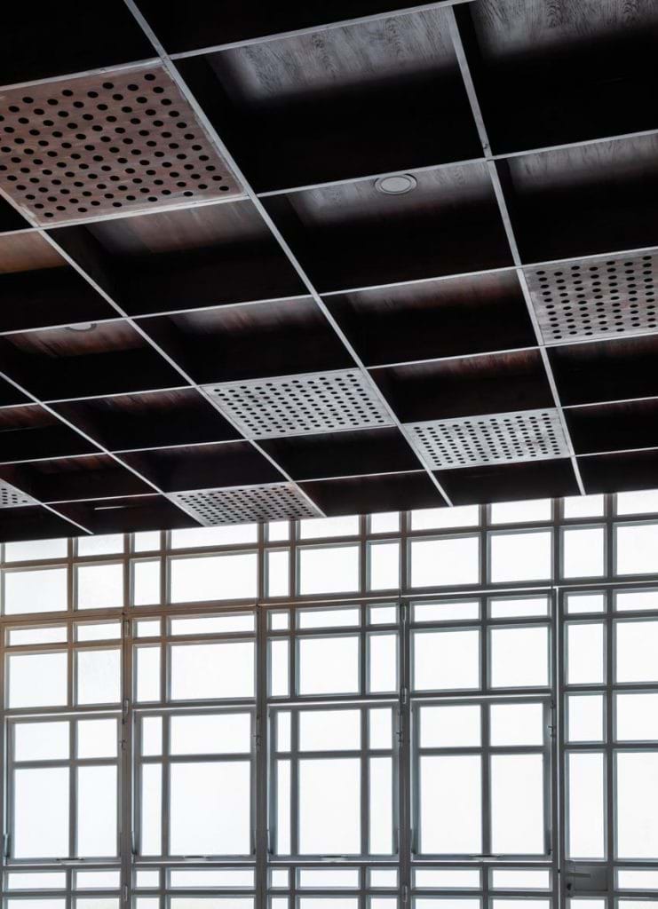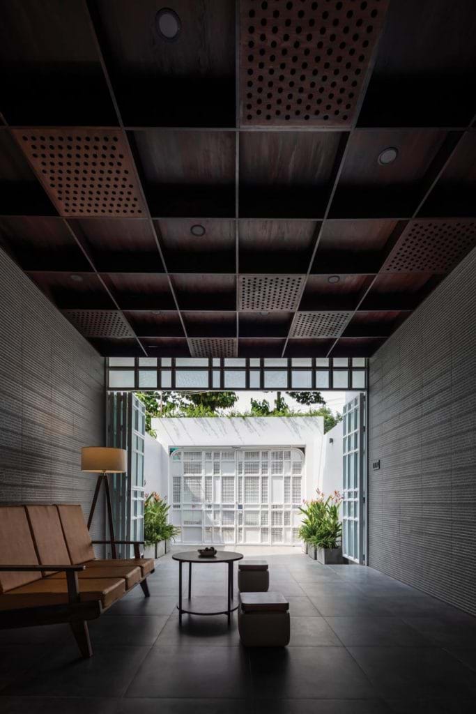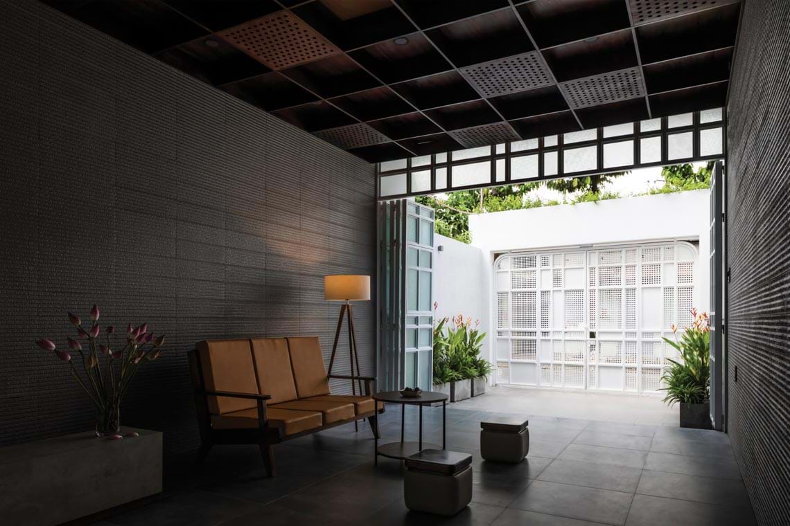 Ở khu vực không gian mặt tiền nhà gần đường thường bị ảnh hưởng bởi tiếng ồn giao thông, chúng tôi đã chọn hoàn thiện tường bên trong bằng vật liệu có bề mặt gồ ghề. Hệ trần được thiết kế thành hệ khung dày và rỗng, vừa có tác dụng thẩm mỹ, vừa tiêu bớt lượng âm thanh đến từ bên ngoài.