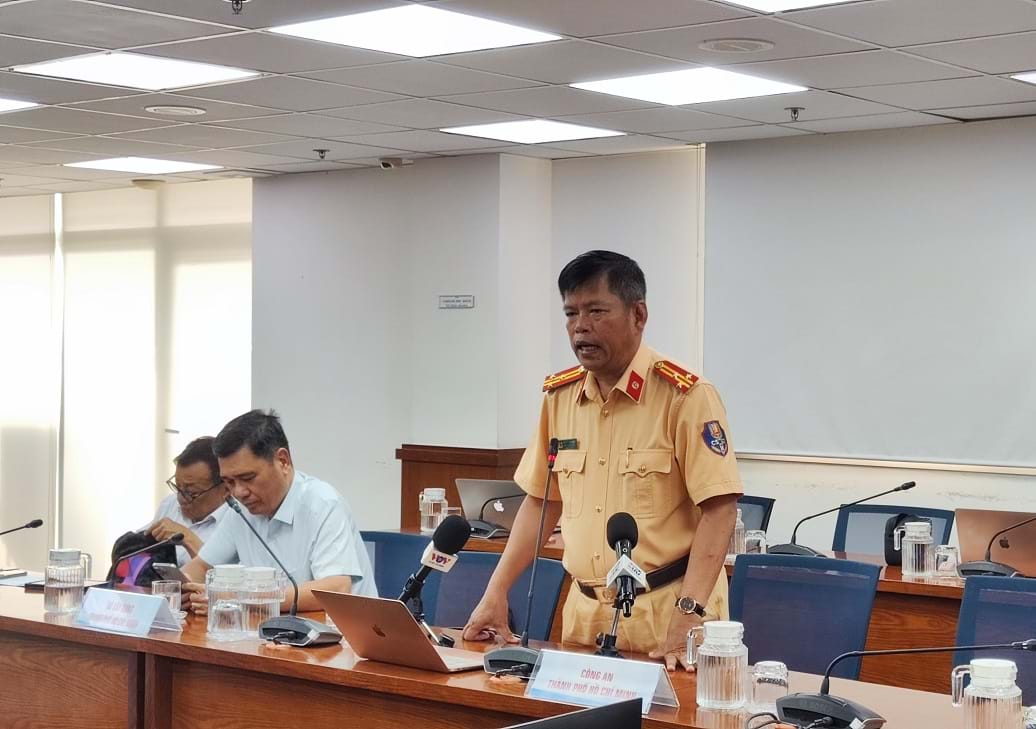 Thượng tá Nguyễn Văn Bình, Phó Trưởng Phòng Cảnh sát giao thông, Công an TP.HCM, chia sẻ tại họp báo. Ảnh: T.D.