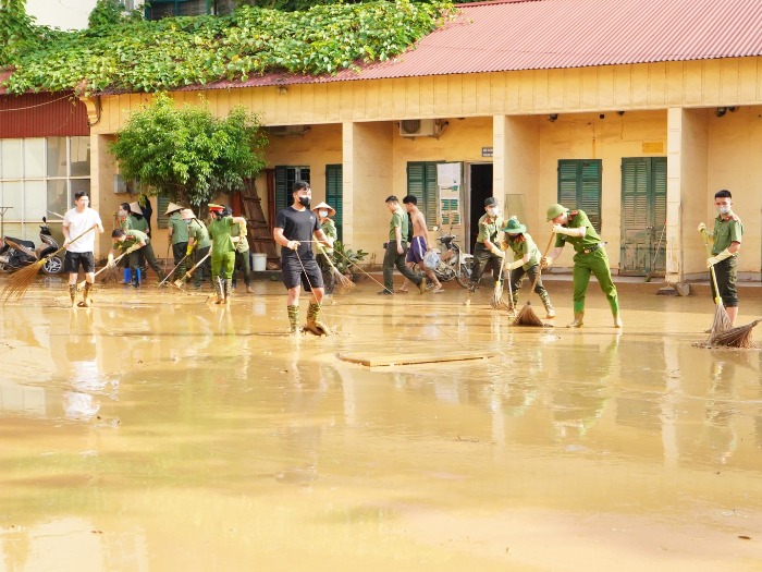 Công an tỉnh Thái Nguyên hỗ trợ cùng nhân dân dọn dẹp, vệ sinh môi trường sau mưa lũ, ngập lụt.
