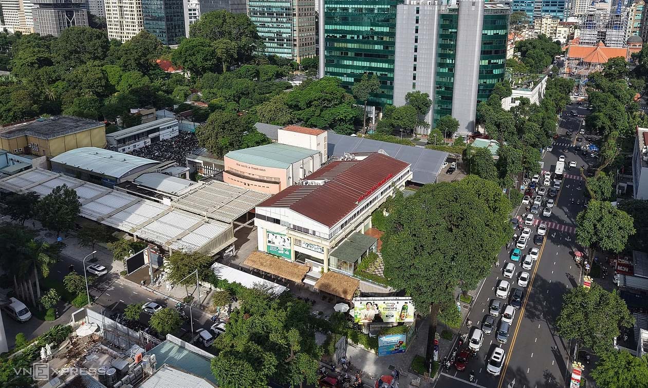 Nhà văn hóa Thanh niên trước khi phá dỡ. Công trình này nằm trên mặt tiền 4 đường ở quận 1 và quận 3 là Phạm Ngọc Thạch, Nguyễn Thị Minh Khai, Hai Bà Trưng và Nguyễn Văn Chiêm. Ảnh: Vnexpress